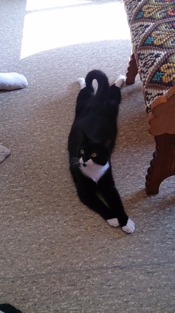 hun har 4 hvite sokker og hvit i ansikt og hals. Hun kan være sky for fremmede, men rolig. Hun er større nå enn på bilde og har hengemage.