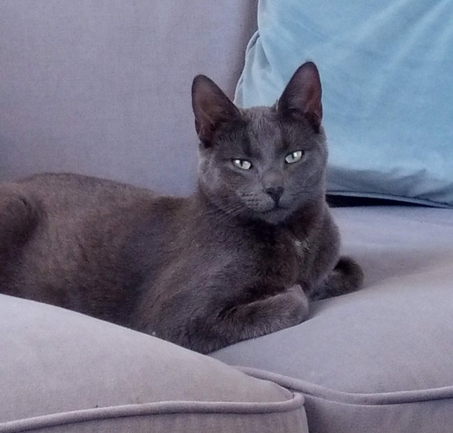 Mörk grå med liten vit fläck på bröstet och under magen,gulgröna ögon.