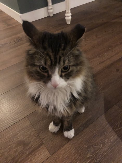 Han er kontaktsøkende og tam, men liker ikke å bli løftet opp. Stryker seg rundt bena.