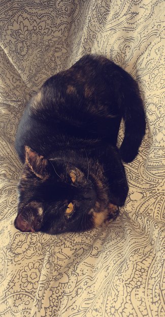 Den er triocolor, brunsort med hvit/beige spill i pelsen.