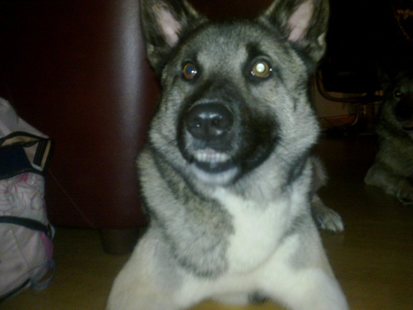 Nikko er lys stort sett, men er mørk i ansiktet ! Lyse / hvite foter og har halen i krøll oppå ryggen !