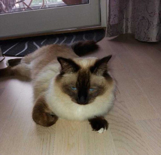 Hankatt litt over et år gammel. Blanding av Hellig Birma og Ragdoll. Han har hvit/lysebrun halvlang pels, lyseblå øyne, mørkebrunt nese- munnparti og mørkebrune ører.