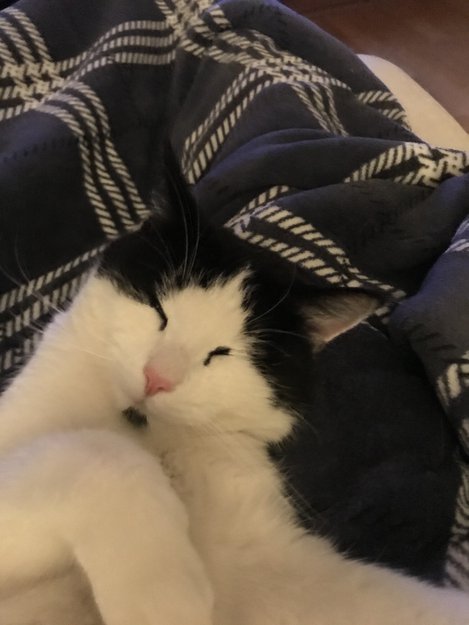 Svart og hvit hunnkatt med en svart prikk på haken lyder navnet dasy . Hun er veldig kosete men liker ikke bråe bevegelser
