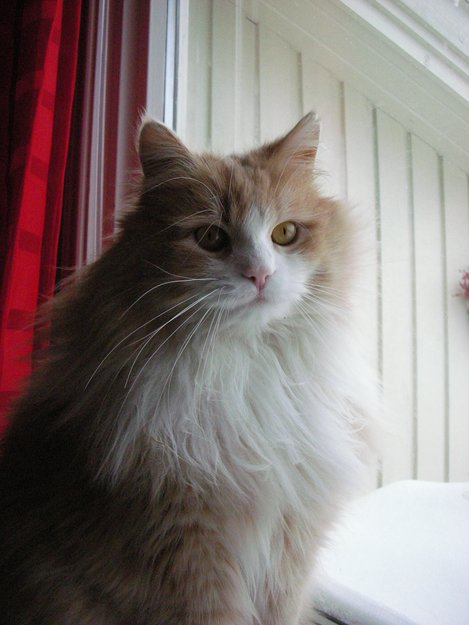 stor katt med gule øyner, rift i det ene øret. gulbrun langhårete pels og hvitt bryst. redd for fremmede folk.