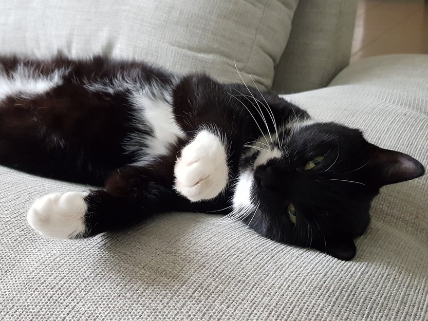 Hun har hvit flekk bare på ene siden av munnen. Og sort på andre siden. Hun er liten av vekst, men fullvoksen. Litt sky, men veldig snill!