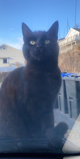 Hun er snart 2 år men veldig liten og lett ser ut som en kattunge. Hun er sort litt brun aktig i sola med noen hvite strå høyt ved brystet. Hun er også veldig kosete men kan også være litt skeptisk