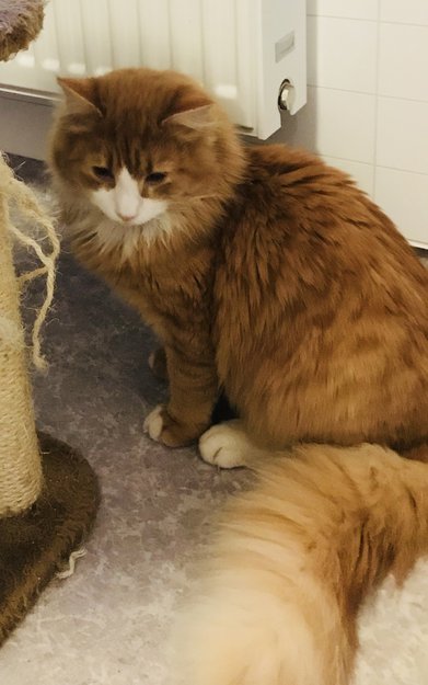 Katten er rød (gul) og hvit i ansiktet med halvlang pels. Rufsete hale. Kan ligne litt på en liten rev med hvit haletipp.
