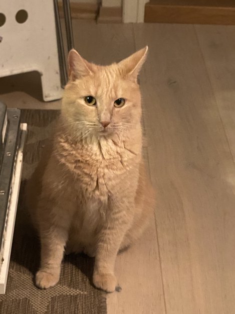 Funnet denne katten på terrasen og var veldig sulten. Hun fikk mat og drikke og var hos oss flere timer om dagen. Vi visste ikke om hun er hjemløs eller hun bare kommer hos oss på besøk.