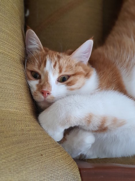 Liten, oransj og hvit korthåret tigerkatt. Liten og nett hunnkatt på ca. 4 kg