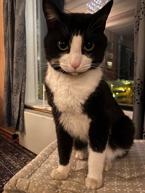 Svart med hvitt i ansiktet, potene og fra halsen og ned under. Middels stor hannkatt med temmelig lang svart hale. ID tatovert i øret. Ute er han veldig skvetten, så vi tror ikke det er sannsynlig at han har blitt med noen andre hjem.