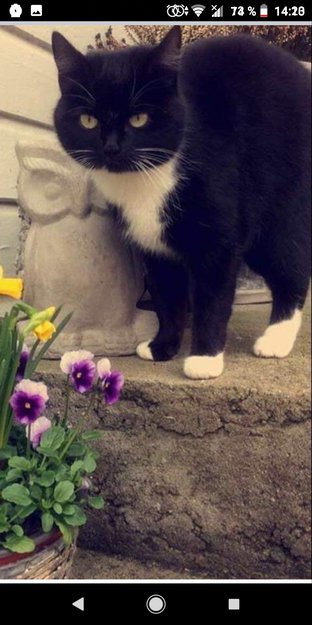 Hvite poter, hvit på brystkassa, helsort hode med hvite værhår, grønne øyne, lyder navnet sitt Lillepus.