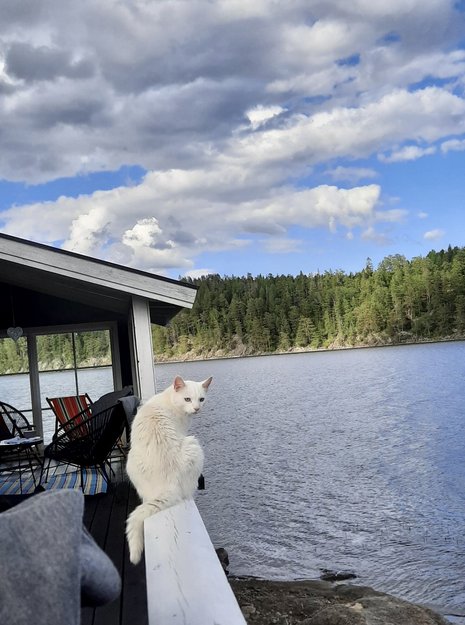 Leo stakk ut om natten på hytta, og kom ikke igjen. Vi lett og ropt etter han hver dag siden. Leo er kritthvit med lyseblå øyne og reagerer også på plystring.