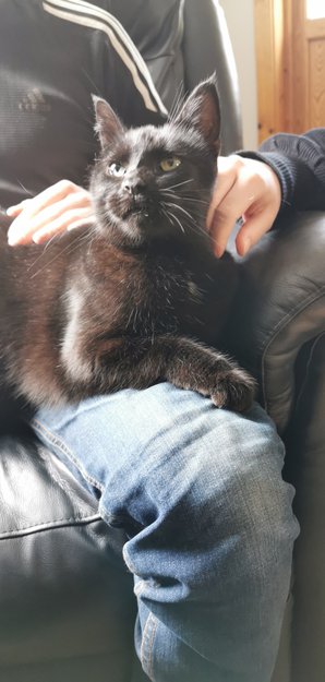 Hun har noen få hvite hår på brystet, veldig klare grønne øyne. Hun er uredd og er en ordentlig kosekatt. Hun har også en hudklaff på magen og ser ut som hun svaier litt når hun går, er litt overvektig. Hun har vært på tur før og vært borte i et halvt år.