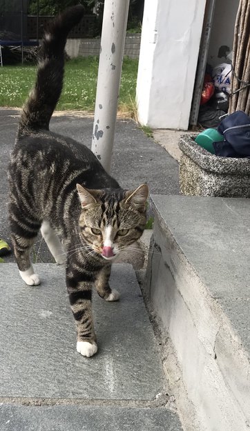 Katten har vært i hagen og rundt huset vårt siden kl 17 i går ettermiddag. Den mjauet intenst til å begynne med så vi trodde det var noe galt med den. Tam og tillitsfull. Den la seg etterhvert på terrassen bak huset. Står nå ved terrassedøren og skraper og mjauer.