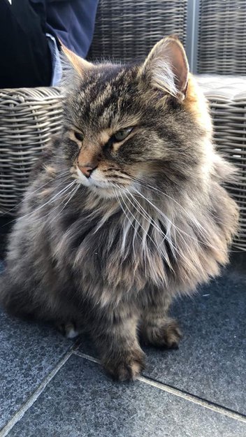 Sibirskogkatten, Spraglete, stor buskete hale og grønne øyne. Litt sky, men veldig kosete. Mjauer ikke/svært lite og lavt. Han er dypt savnet i familien sin. 😢. Katten er ID merket.