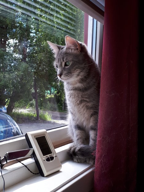 Han er en liten hankatt som nettopp har fylt 1 år. Han har et blikk som gjør at han ser vettskremt ut.