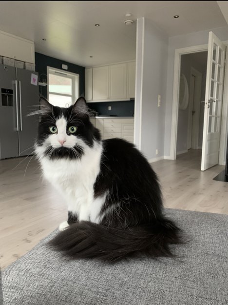 Hvite symmetriske tegninger i fjeset og sort hake. Mest hvor forran og mest sort bakdel. Folkesky. Er gjerne Sammen med en liten sort katt da de bor sammen og stort sett holder sammen når de er ute.
