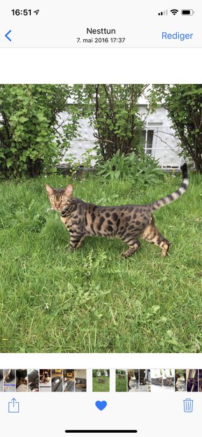Bengalkatt, slank type. Er chippet, men har ikke ID-tatovering eller halsbånd.