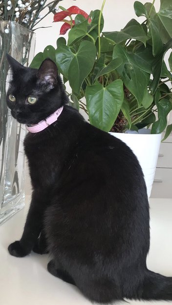 Gzgz har hvit merke på magen som ligner litt på et hjerte, og har på seg rosa halsbånd.