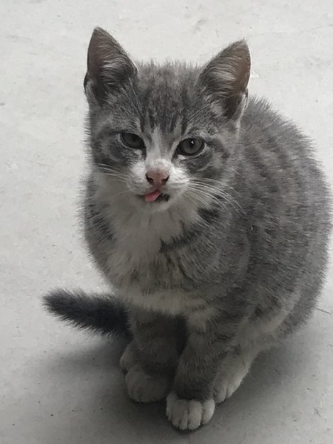 Lysegrå kattunge med hvitt bryst og hvite poter funnet under panseret på bilen vår. Usikker om den har klatret opp der her hvor vi bor, eller i Solakrossen som bilen var det meste av søndagen.