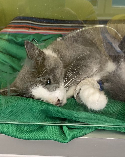 Skadet kattunge funnet i en garasje på Schous plass ved Deichmanske bibliotek. Kontakt Evidensia Oslo dyresykehus