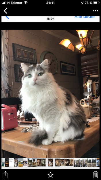 Den er langhåra, lita, gråsvart på rygg med litt svakt brunt i og kvit. Litt Stor hale.