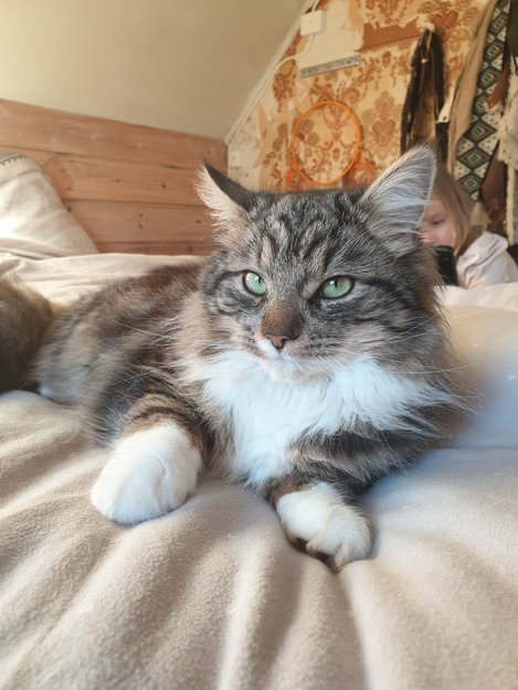 Han har grønne øyne, pelsen er spraglete med både brune og gråe toner. Han har hvit krage og hvite bein. Under foten har han et svart merke. Litt usikker hvilken fot det er. Han er kastrert og chippet.