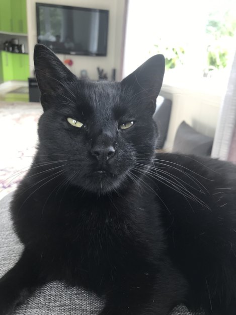 Litt slim i kanten av øynene (allergi). Forsiktig katt, lar ikke fremmede komme for nær.
