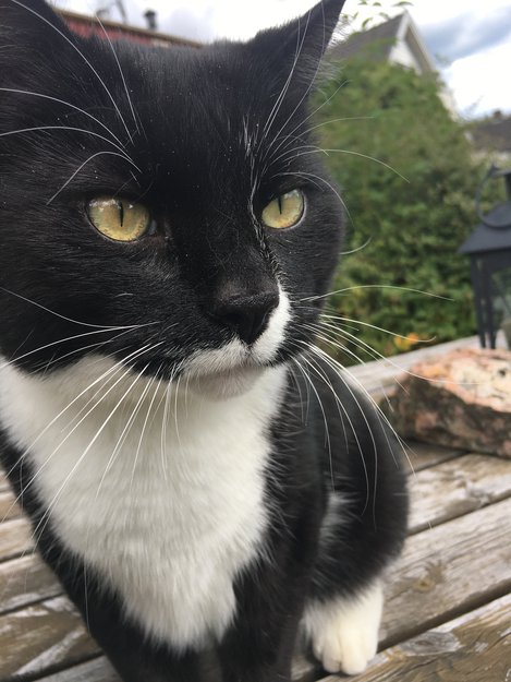 Han kom ikke hjem på lørdagskvelden. Han kan komme og gå når han vil gjennom chipstyrt katteluke. Men vil alltid komme hjem og spise. Har ikke kommet inn når det regner heller. Kosepus.
