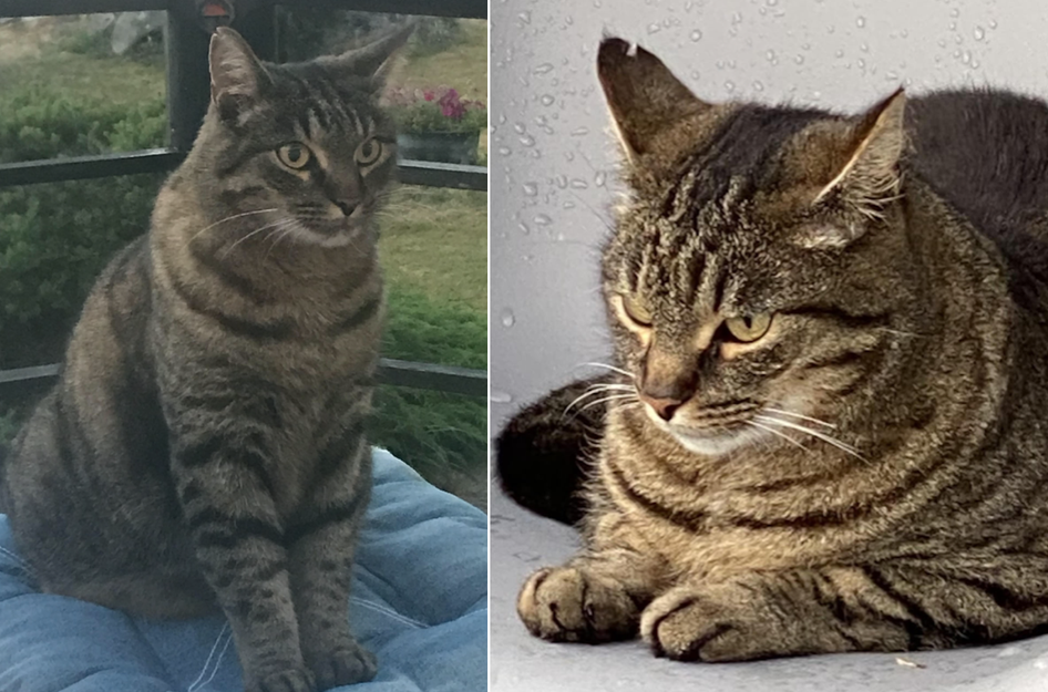 Stor (7 kg) robust katt - med en særegen rift i høyre øre. Snill, kjælen, kan være litt sky/skvetten, men veldig glad i mat.