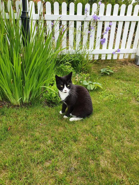 Katten er i hagen vår, og vil ikke gå. Den er veldig kontaktsøkende.