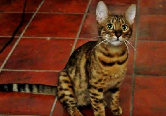 Hun er en liten bengalkatt (brun og gul med sorte striper og leopardflekker) Veldig pen. Hun "snakker" mye, men er redd for mennesker, så vil sannsynligvis gjemme seg.