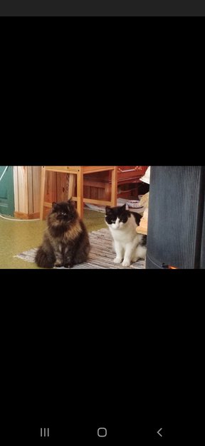 Disse to er veldig gode venner. Hannkatten snakker mye. Begge er veldig sky.