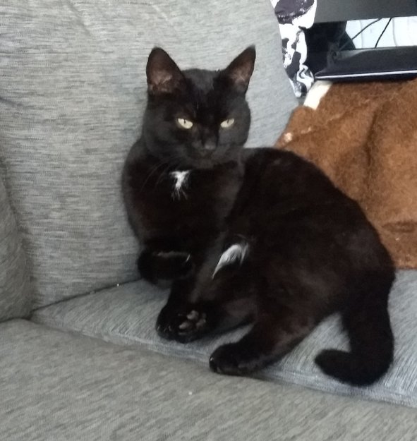 Liten og svart med litt hvit under haken og mellom bakbena. Tillitsfull , men redd for biler.