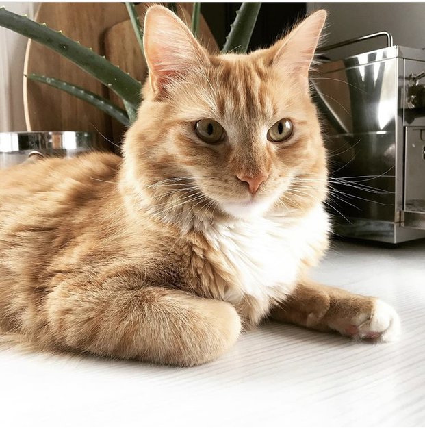 Orange og hvit. Kastrert. Fin i pelsen, lodden. Vekt ca 5,2kg