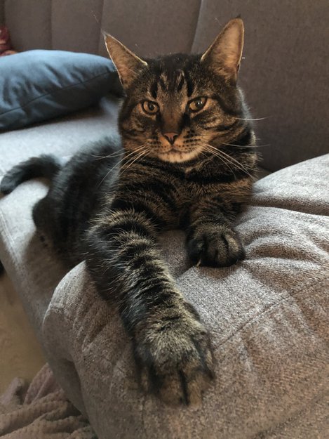Han er en 7 år gammel kastrert hannkatt. Han er stripete og har en hvit flekk under haka.