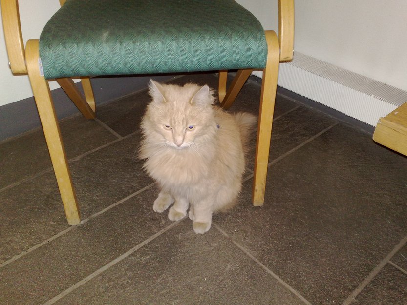 Det är en katt som brukar sova i stolen vid ingången och har en gång följt med och ställt sig utanför vår dörr och jamat. Den har ett halsband med två otydliga telefonnummer men inget av dem går att ringa. Ett Svenskt och ett Norskt.