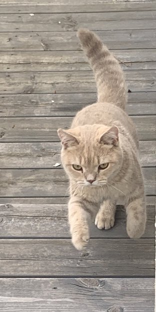 Katten har vært i hagen vår i hele ettermiddag, ligger i en sofa utenfor døren, er kosete og vil gjerne inn.