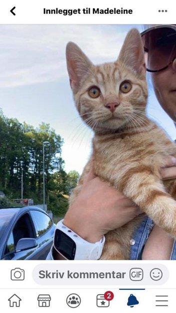 Kosete, rød kattunge oppsøker folk på støleveien. Umerket (ingen merke i øret). Tatt inn av meg, leveres Dyrenes hjelper hvis ikke eier melder seg raskt.