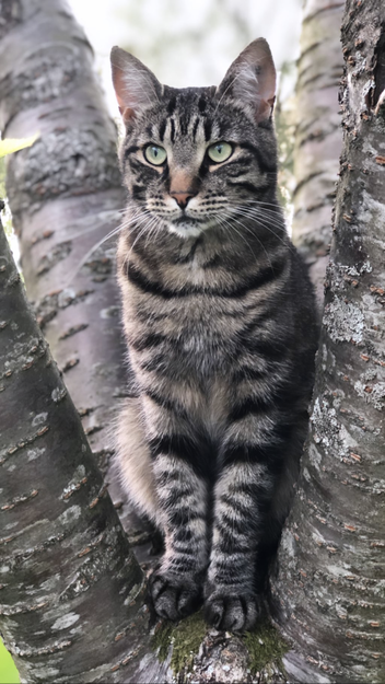 Han er øretattovert, chippet og kastrert. Han er veldig snill og rolig straks 4 år gammel katt, men usikker blandt fremmede og når det et mye bevegelse/støy. Tar i mot mat fra fremmede. Han har hårtuster på enden av ørene og store fine poter. Kan se ut som om han har svarte sokker på bakbeina. Myk og god pels, røyter en del nå på sommeren.
