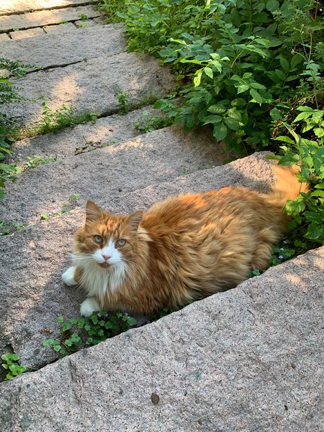 Stor langhåret katt. Veier rundt 6 kg. Han er oransje og hvit på halsen og på potene.