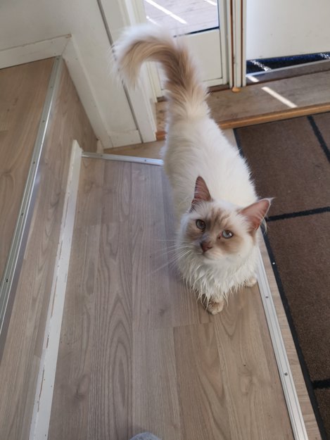 Katten dukket opp lørdag kveld, vi har aldri sett den her i området før. Svært kontaktsøkende og vil inn. Hvit, ren og velstelt pels. Virker som at det er ei innekatt.