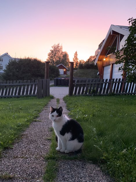Pelle er en hvit og svart katt med en hvit haletupp.Veldig nyskjerrig og en kosete katt.
