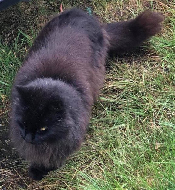 Dette er en godt voksen katt, antagelig en hankatt, men vet ikke. Vanskelig å se fordi han har masse tykk pels. Han er sort med brunskjær og mye grå underpels, spesielt rundt nakken.