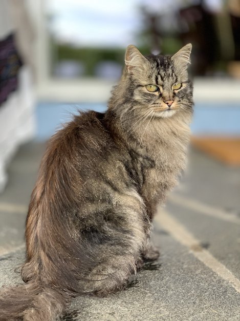 Langhåret norsk skogskatt. Grå, brun og hvit i pelsen. Slank, stille og rolig. Ukjent kjønn.