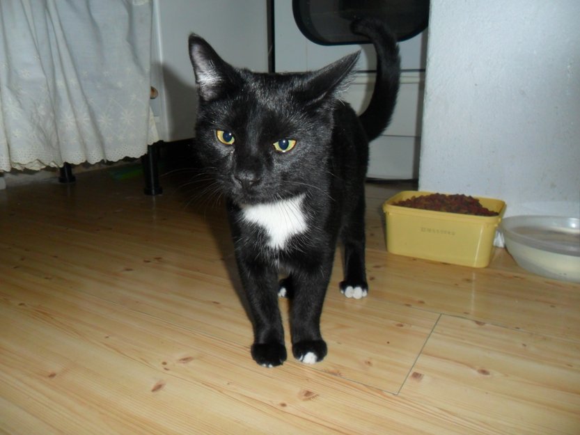 Han har små hvite sokker og hvit på brystet, resten er sort. Når du klapper han setter han baken ned mot bakken. Snill pus som reagerer på navnet "Sparta". han skjeler bittelitt.