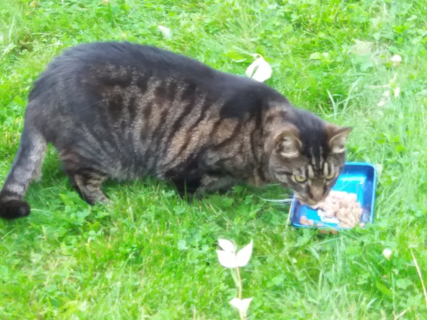 Mørk, nesten svart på ryggen. Menneskevant. Ikke aggresiv mot min katt eller meg. Kjørte den til veterinær i dag for å sjekke om den var chippa, den var helt rolig i buret og under bilturen, mjaua ikke engang. I god form, ingen synlige lidelser.