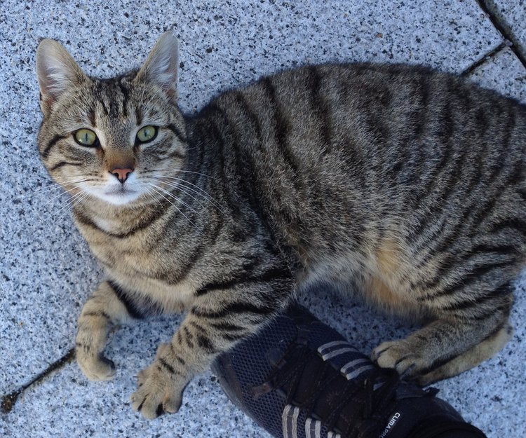 Katten kom til gården for noen dager siden ca.25. mars, og har holdt seg rundt bygningene siden da. Den viser ingen tegn på å gå videre. Fikk ikke mat i begynnelsen, men fikk litt tørrfor i går kveld (30.).