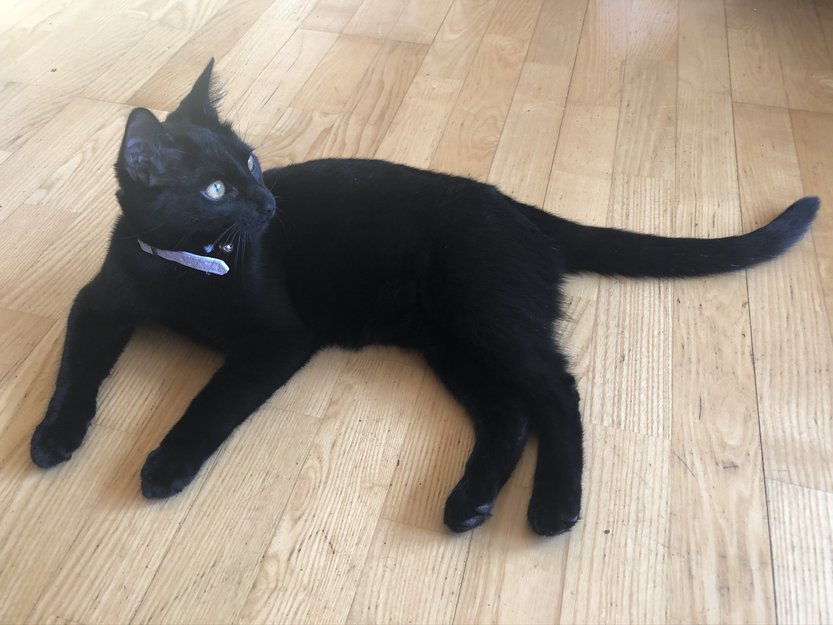 Noen få hvite hår på mage og bryst. Sennepsgule øyne. Veldig sosial og blid, hilser på alle, går inn i andres hus. Nysgjerrig og uredd. Hjemmekjær, aldri vært på langtur.