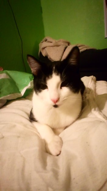 Svart og hvit hannkatt. Men han har en svart flekk på haka der han er hvit.